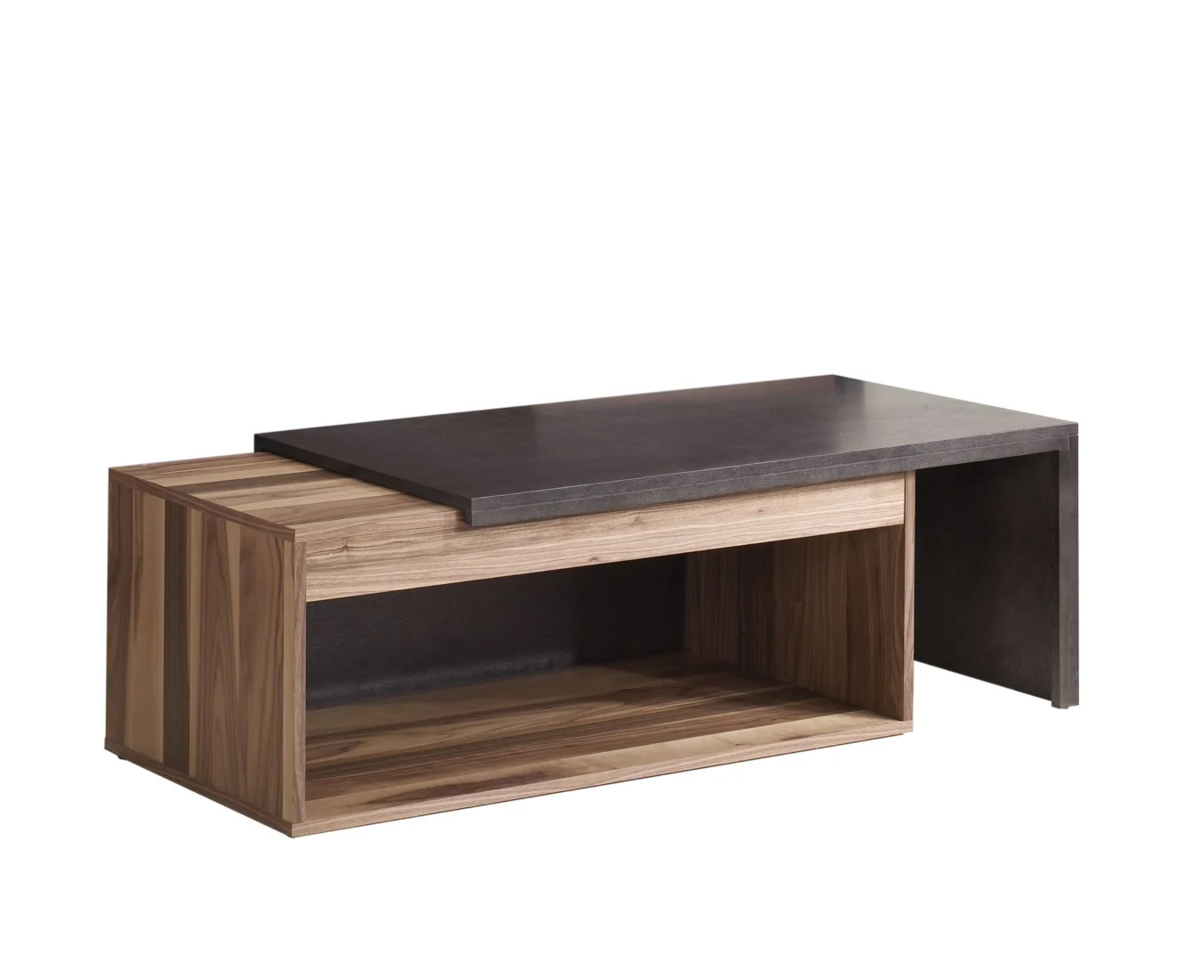 This coffee table reveals the natural beauty of walnut in a clean, timeless design. Its sliding top offers ingenious functionality, instantly transforming your space to suit your needs. The striking contrast between the light wood and ebony creates a captivating visual harmony that complements any interior.